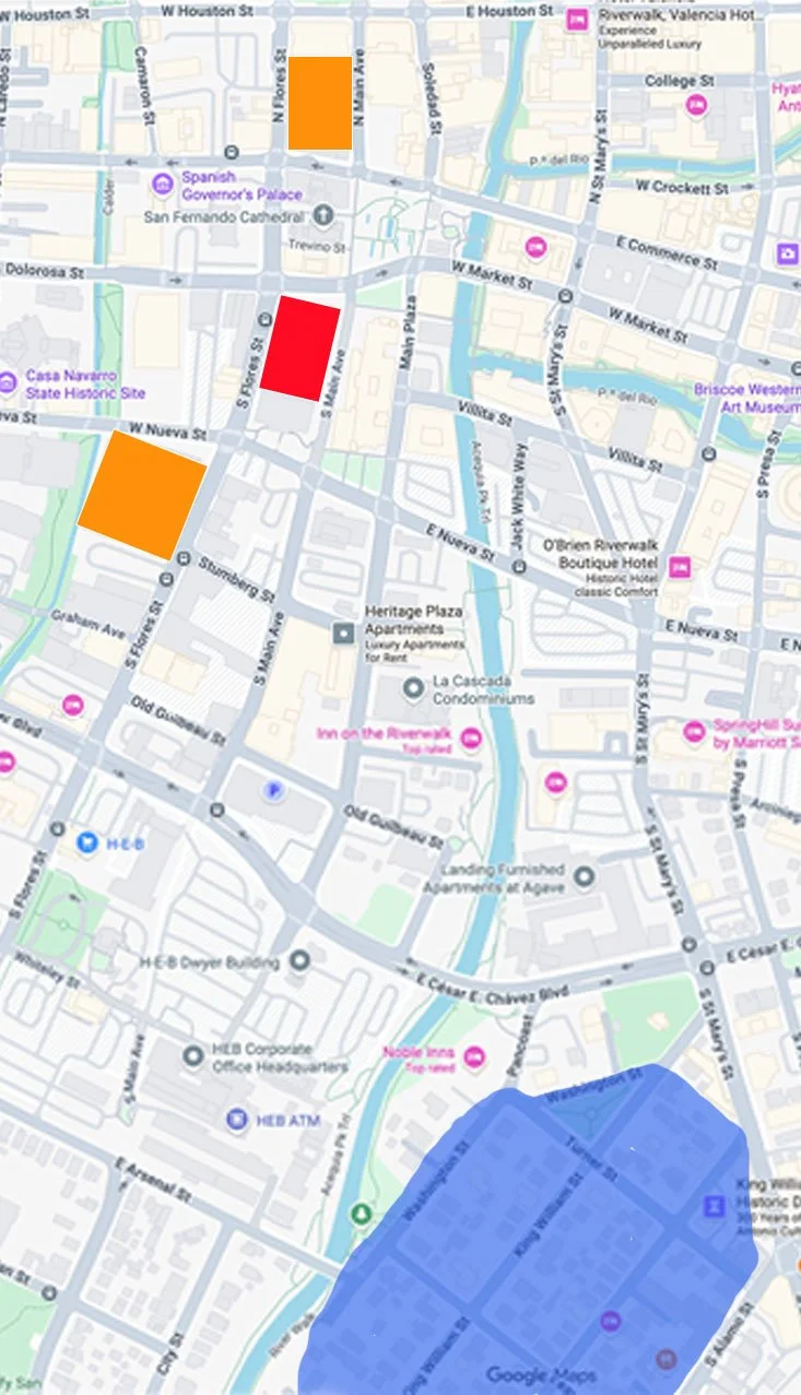 King William Neighborhood (blue): Limited free parking can often be found in the nearby King William neighborhood. Please note this is approximately a 10-minute walk to the courthouse.